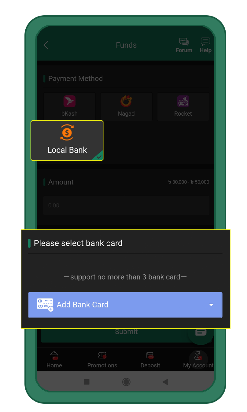 ii) If you’re using the Local Bank, please enter your valid bank details by clicking on the “Add Bank Card” button.