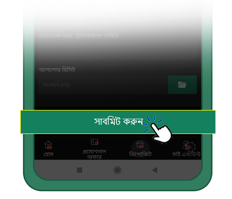 আপনার ফুল অ্যাকাউন্ট নেম লিখুন। আপনার ট্রানজেকশন আইডি বা রেফারেন্স নং দিয়ে ডিপোজিট ফর্মটি পূরণ করুন তারপর, ‘আপলোড রিসিট’ বাটনটি ক্লিক করে লেনদেনের স্লিপ আপলোড করুন।
