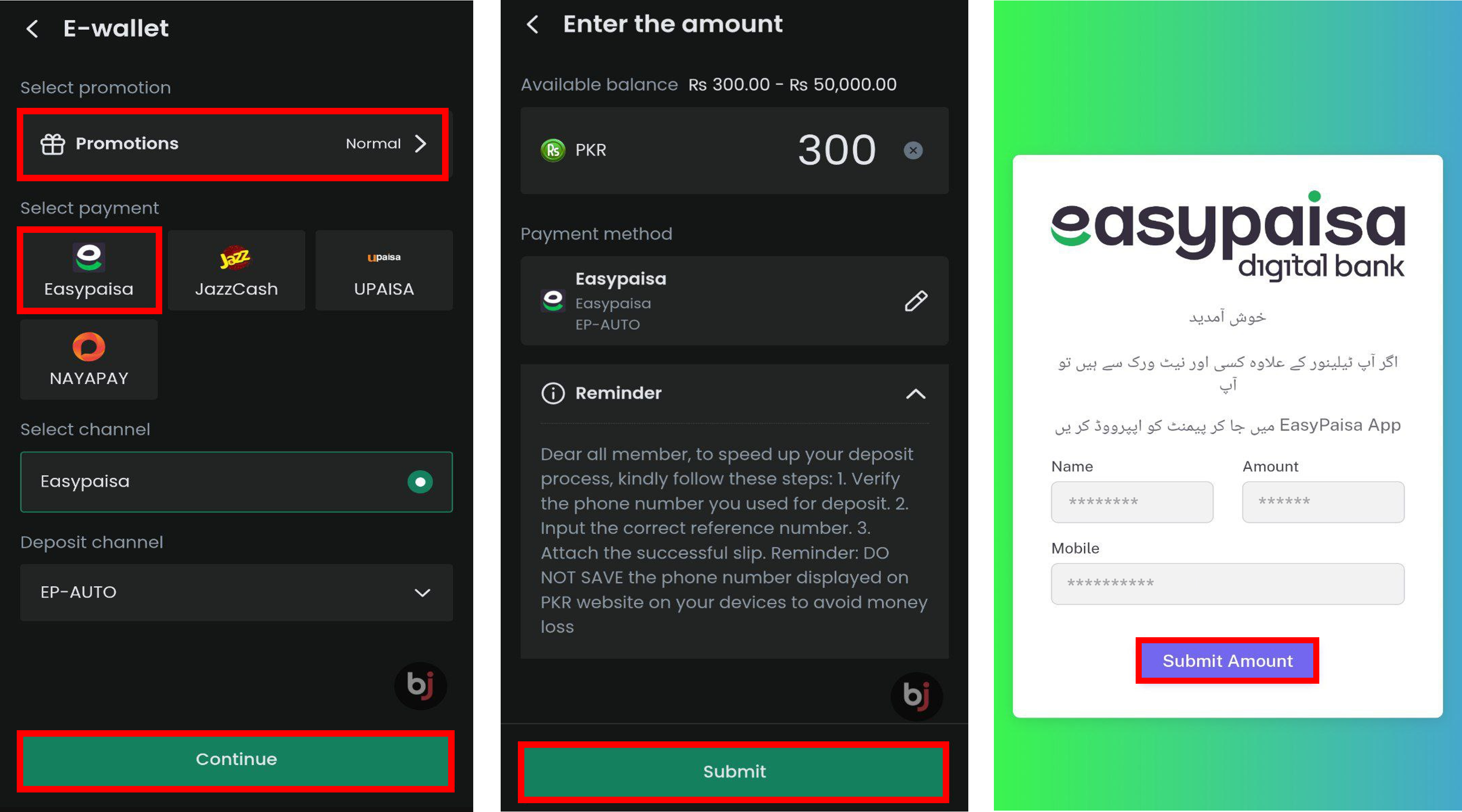 Step 3: Select “Easypaisa”. Enter your desired deposit amount by clicking on the speed deposit button.