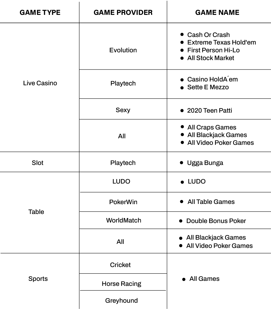 While most bets placed on our platform can be counted towards turnover calculation, and the bonuses we offer can be used on a wide range of games, there are some exceptions. For detailed information about the games and sport markets excluded from bonus wagering and turnover calculations, please refer to the table below: