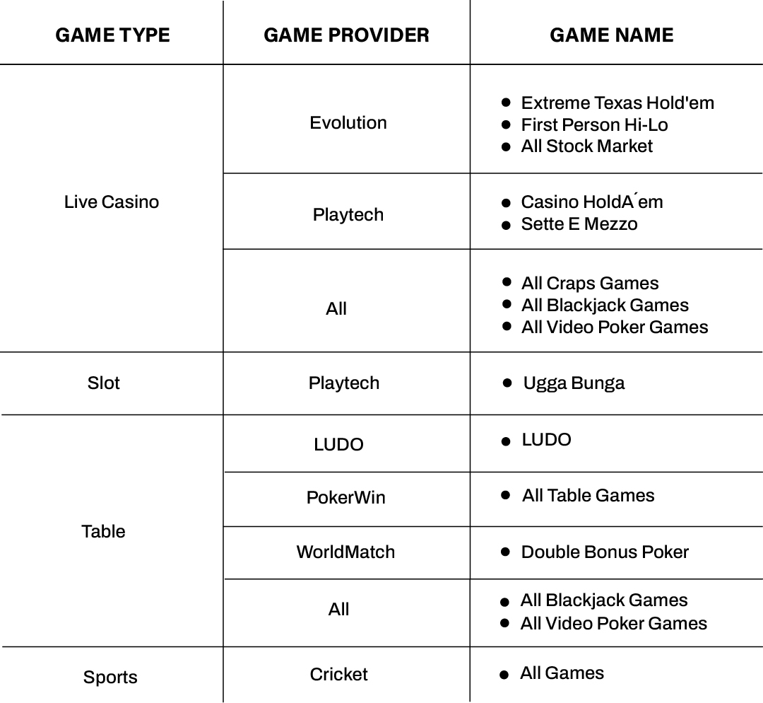While most bets placed on our platform can be counted towards turnover calculation, and the bonuses we offer can be used on a wide range of games, there are some exceptions. For detailed information about the games and sport markets excluded from bonus wagering and turnover calculations, please refer to the table below: