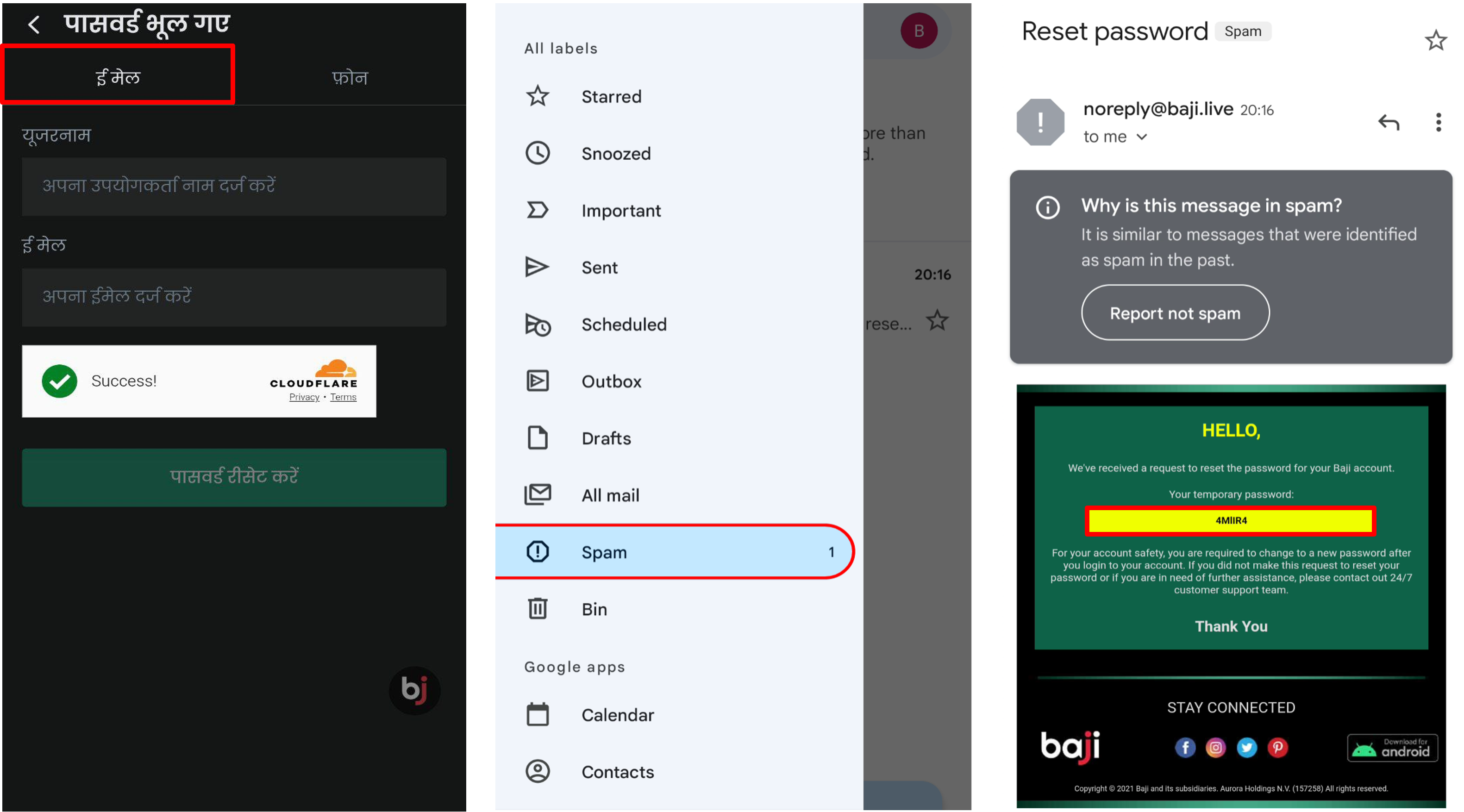 i) यदि आप ईमेल के माध्यम से अपना पासवर्ड रीसेट करना चाहते हैं, तो कृपया अपना उपयोगकर्ता नाम और अपने Baji खाते से जुड़ा सत्यापित ईमेल पता दर्ज करें और “पुष्टि करें” पर क्लिक करें। लॉगिन करें और यादृच्छिक (रैंडम) पासवर्ड के लिए अपना ईमेल जांचें। यदि आपको ईमेल नहीं मिला है तो कृपया अपना जंक/स्पैम मेल फ़ोल्डर जांचें।