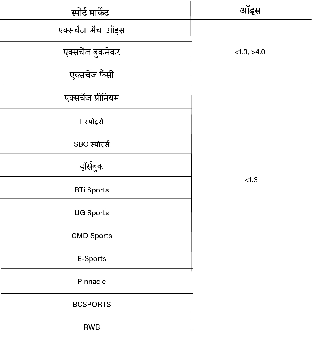 स्पोर्ट्स मार्केट के लिए, हम टेबल पर बताए गए बोनस दांव (वेजरिंग) और टर्नओवर की गणना नहीं करेंगे।