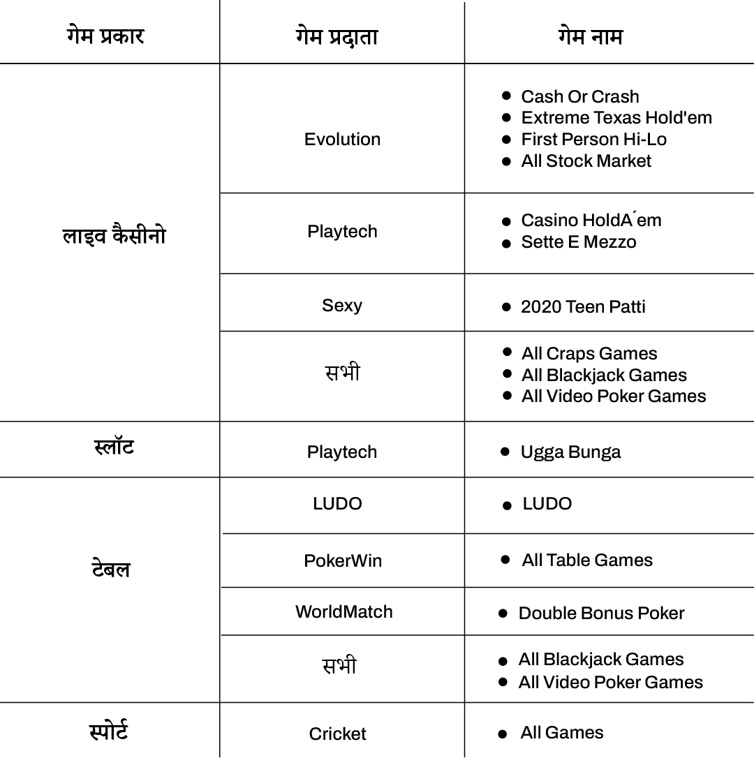 जबकि हमारे प्लेटफ़ॉर्म पर लगाए गए अधिकांश दांवों को टर्नओवर गणना में गिना जा सकता है, और हमारे द्वारा दिए जाने वाले बोनस का उपयोग खेलों की एक विस्तृत श्रृंखला पर किया जा सकता है, कुछ अपवाद भी हैं। बोनस दांव और टर्नओवर गणना से बाहर रखे गए खेल और स्पोर्ट्स मार्केटों के बारे में विस्तृत जानकारी के लिए, कृपया नीचे दी गई तालिका देखें: