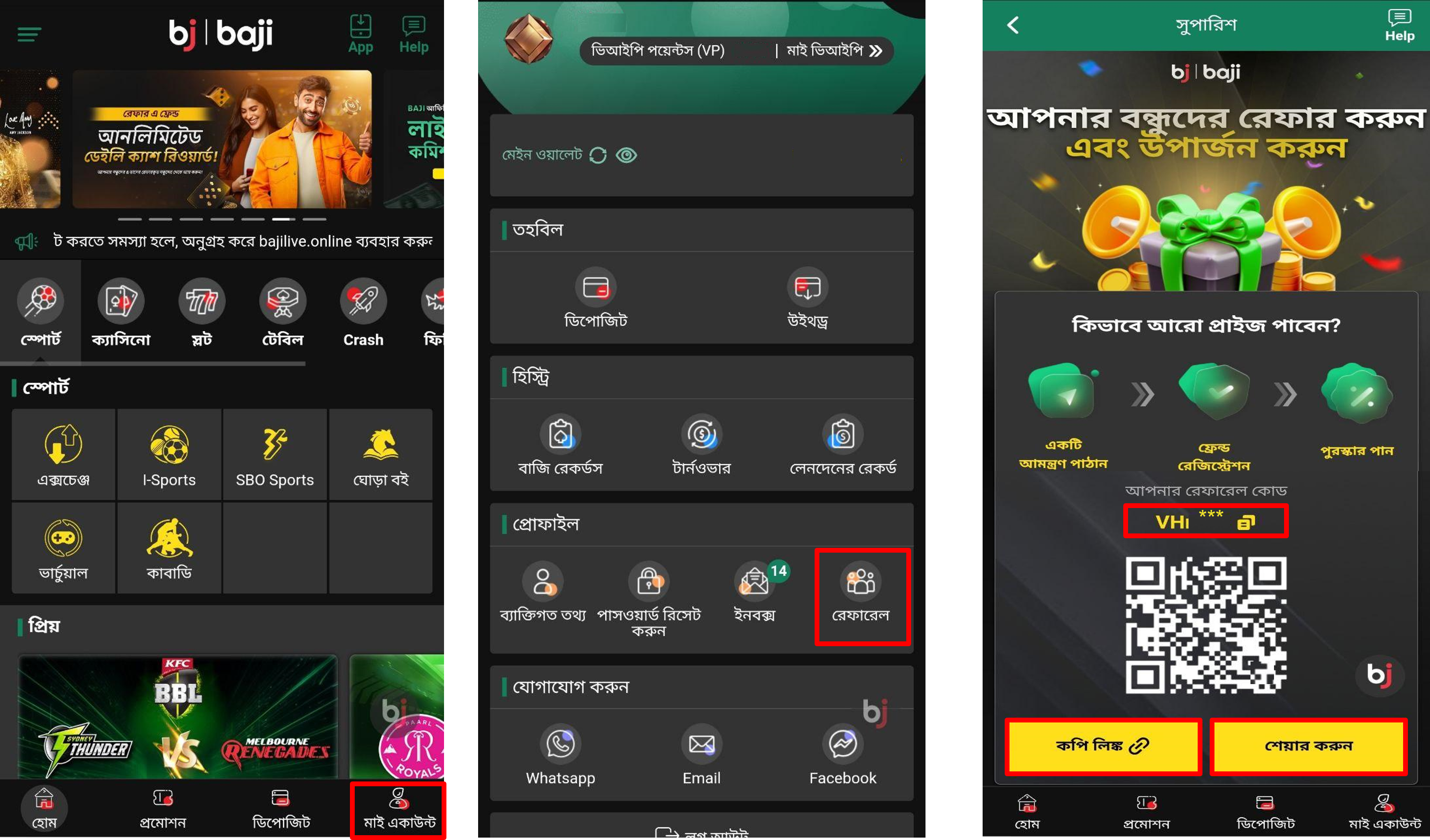 ধাপ ৩: আপনার ডেডিকেটেড ‘রেফারেল কোড’ শেয়ার করতে ‘শেয়ার’ এ ক্লিক করুন অথবা আপনার বন্ধুদের সাথে আপনার জন্য ডেডিকেটেড ‘রেফারেল লিঙ্ক‘ শেয়ার করতে ‘কপি লিঙ্ক’ এ ক্লিক করুন।