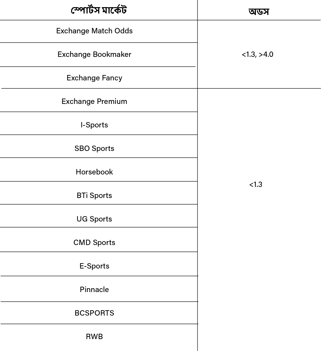 স্পোর্টস মার্কটের জন্য, আমরা টেবিলে উল্লিখিত বোনাস ওয়েজারিং এবং টার্নওভার গণনা করব না।