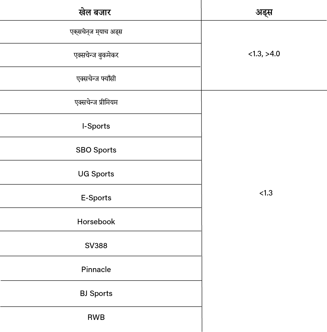 ** एक्सचेन्ज फेन्सी र बुकमेकर बाधाहरूलाई निम्न गणना प्रयोग गरेर EU बाधाहरूमा रूपान्तरण गरिनेछ: (बिजोर/१०० ) + १ ।