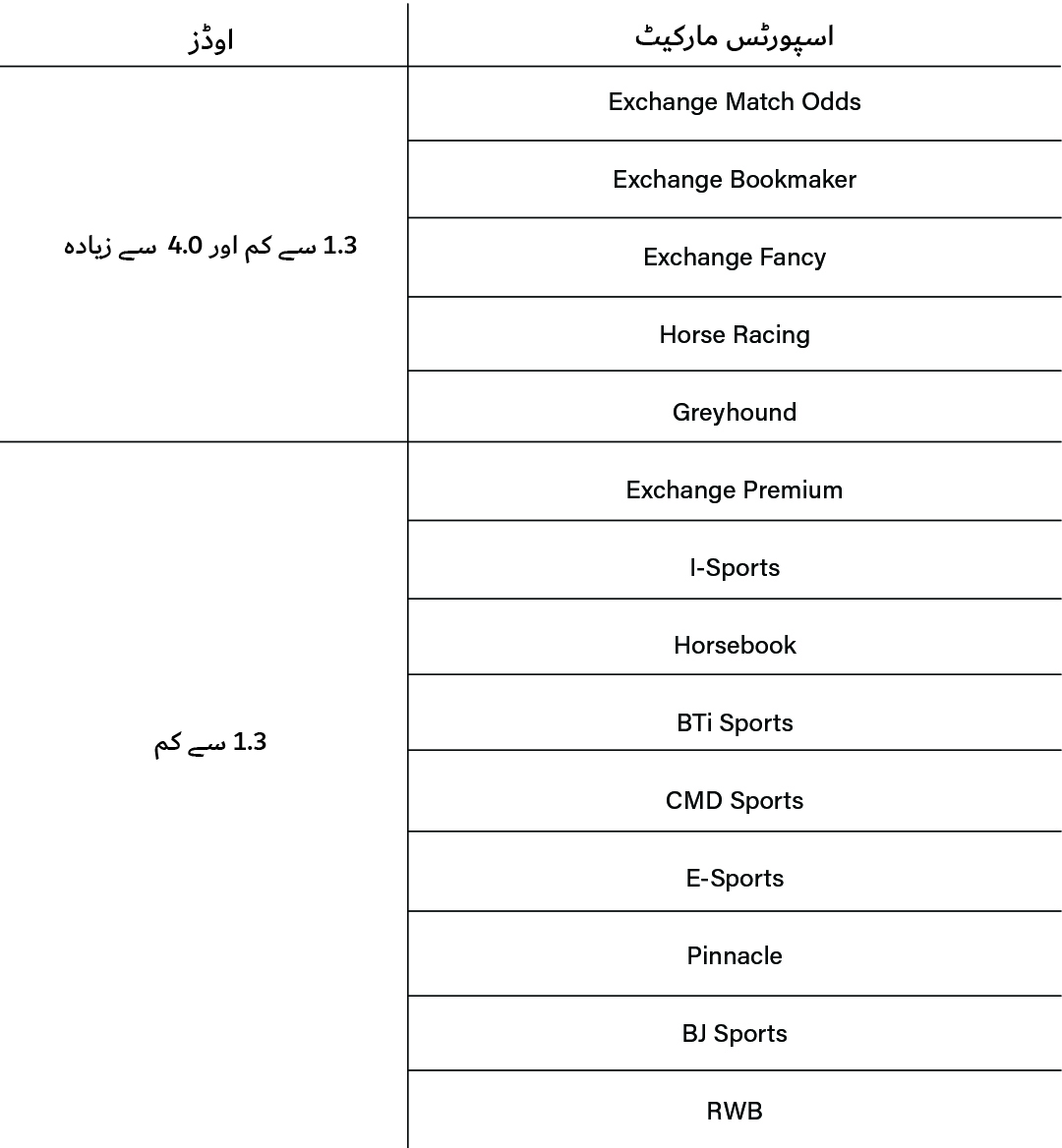اسپورٹس مارکیٹ کے لیے، ہم ٹیبل میں درج بونس ویجرنگ اور ٹرن اوور کا حساب نہیں لگائیں گے: