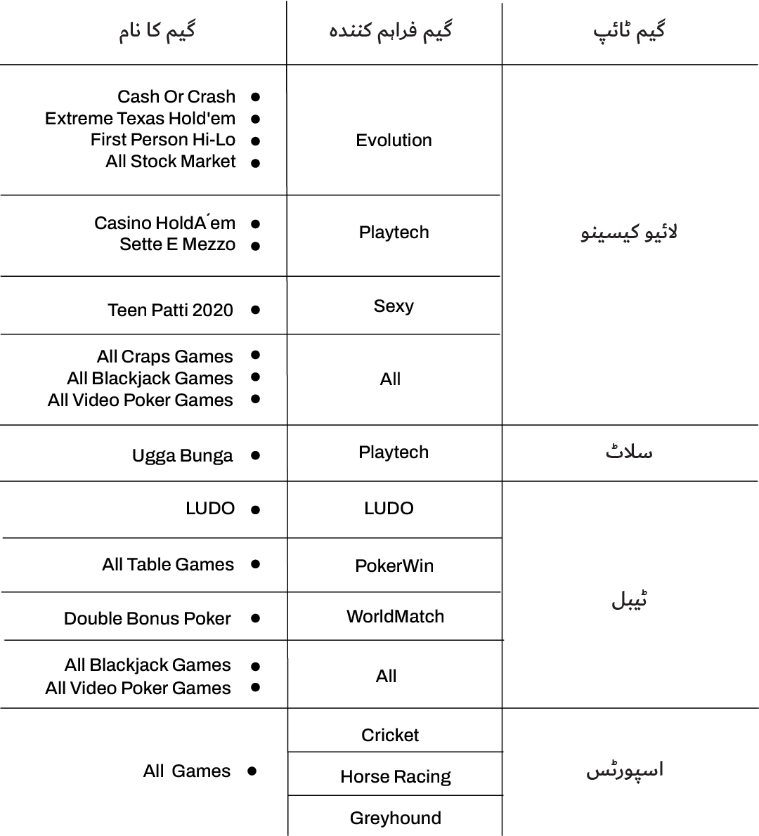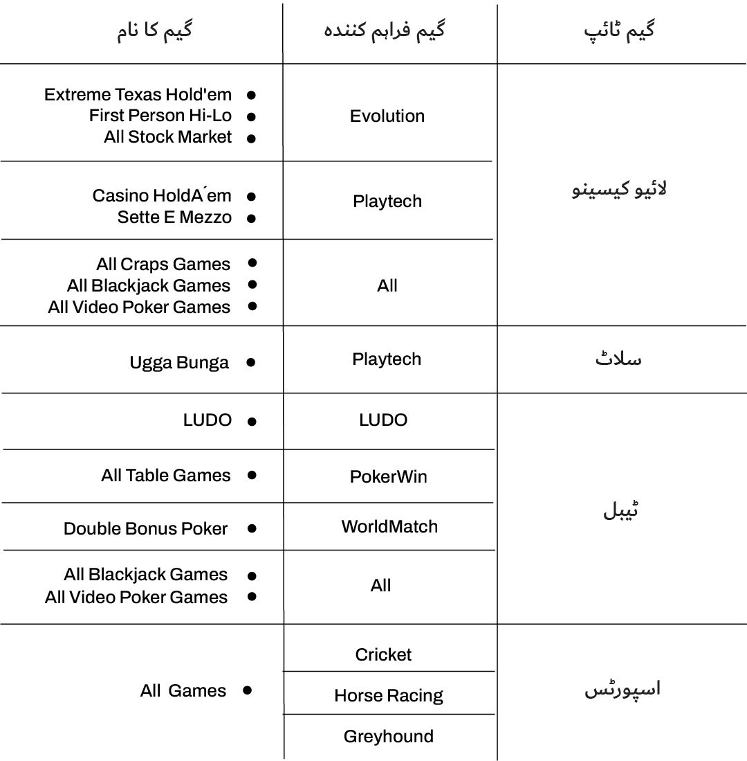اگرچہ ہمارے پلیٹ فارم پر لگائی گئی زیادہ تر شرطوں کو ٹرن اوور کے حساب میں شامل کیاجاتا ہے، اور ہم جو بونس پیش کرتے ہیں وہ وسیع پیمانے پر گیمز پر استعمال کیے جا سکتے ہیں، لیکن کچھ استثنیٰ بھی موجود ہیں۔ بونس ویجرنگ اور ٹرن اوور کے حساب سے خارج شدہ گیمز کی مکمل تفصیلات جاننے کیلئے، براہ کرم نیچے دیئے گیا ٹیبل ملاحظہ کریں: