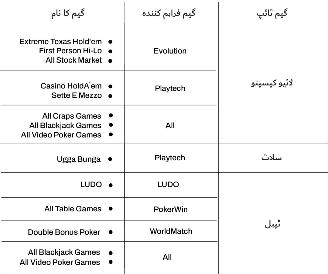 اگرچہ ہمارے پلیٹ فارم پر زیادہ تر شرطیں VIP پوائنٹس کمانے میں شمار ہوتی ہیں، لیکن اس اصول کے کچھ استثنیٰ بھی ہیں۔ VIP پوائنٹس نہ کمانے والی گیمز کی تفصیلات کے لیے، براہ کرم نیچے دیا گیا ٹیبل ملاحظہ فرمائیں: